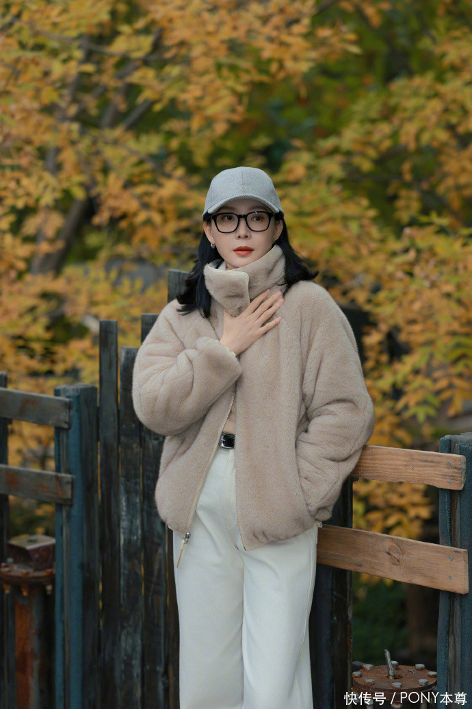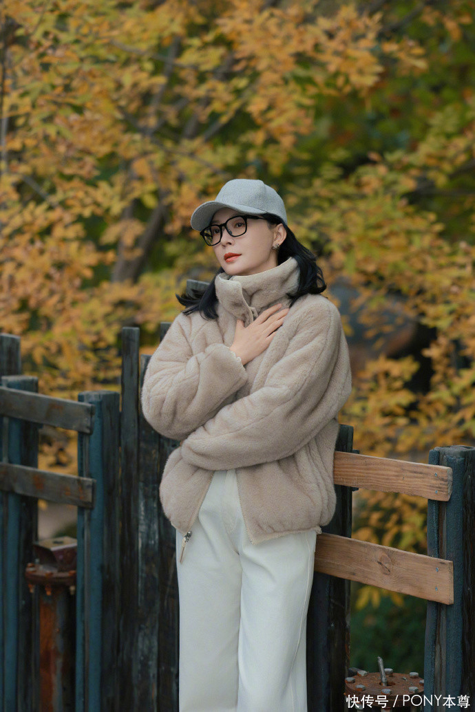 陈数穿搭的一个巨大的亮点是:善于用一些显年轻的基础色。比如白色!棕色毛绒外套是今年流行的款式,搭配什么颜色的裤子,则是显年轻的关键!