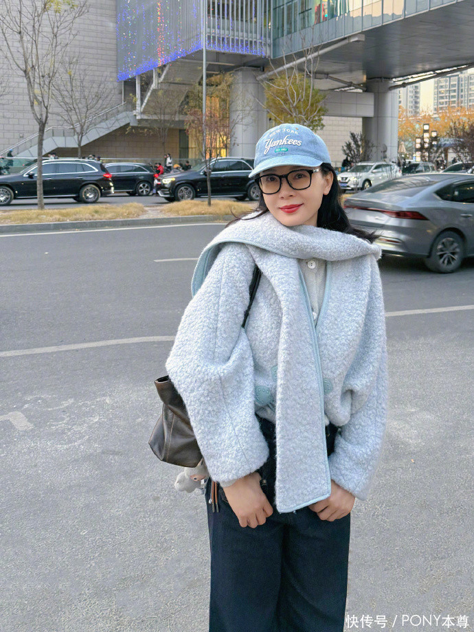 陈数的私服穿搭也尽显年轻态,色彩上的选择值得想要看起来年轻的女性借鉴!比如下面这套蓝色系穿搭,浅蓝色毛毛外套搭配一套同色系围巾,显白减龄,头戴同色系的棒球帽,这件看似简单的单品却将她衬托得格外白皙知性!