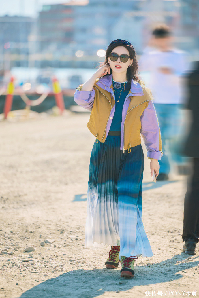 这种渐变色的半身裙和同色系的上衣结合在一起,让她看起来温柔又显高!而外搭的撞色短夹克,在色彩上更加抢眼!