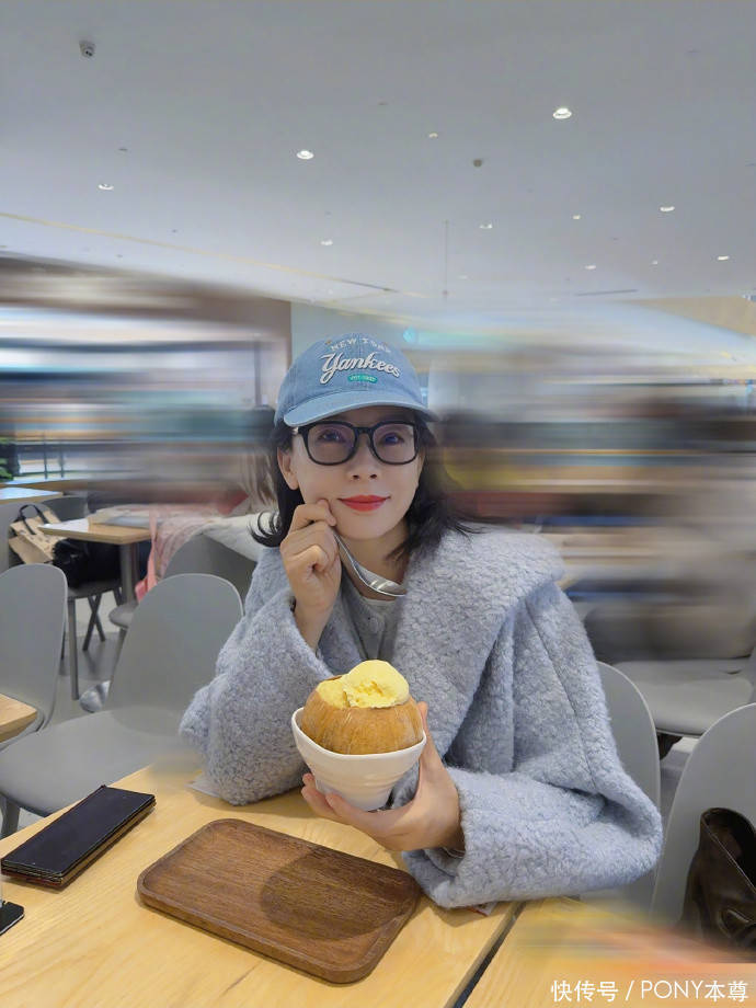 搭配黑色镜框眼镜,妆容精致的她,脸上没有皱纹,看起来优雅从容与精致。